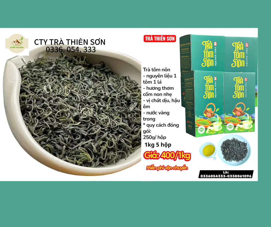 Trà Tôm Nõn Thái Nguyên được chế biến từ nguyên liệu 1 tôm 1 lá hái từ những búp trà non buổi sớm. Đây là dòng trà cao cấp, có hương cốm non tự nhiên, vị dịu, hậu ngọt mềm và nước vàng trong.